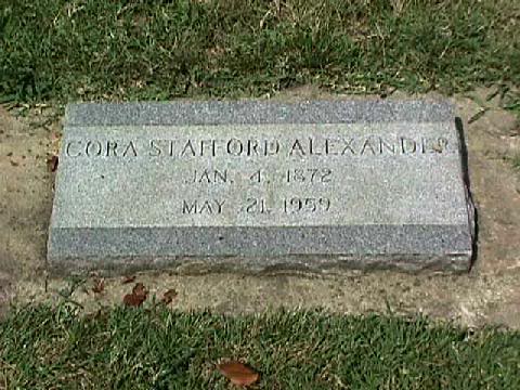 This photograph of Cora Eliza Stafford's gravestone was taken on August 1, 1998. The grave is at the Harrisburg Presbyterian Church Cemetery in Harrisburg, North Carolina; the cemetery is at the northwest corner of North Carolina State Route 49 and Morehead Road, Latitude 35° 19.29′ North, Longitude 80° 39.68′ West.