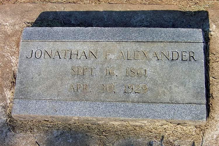 This photograph of Jonathan Franklin Alexander's gravestone was taken on August 1, 1998. The grave is at the Harrisburg Presbyterian Church Cemetery in Harrisburg, North Carolina; the cemetery is at the northwest corner of North Carolina State Route 49 and Morehead Road, Latitude 35° 19.29′ North, Longitude 80° 39.68′ West.