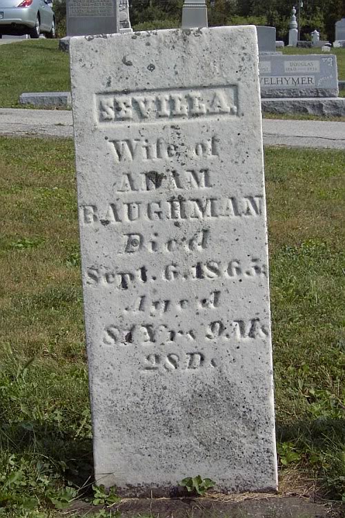 SEVILLA Wife of ADAM BAUGHMAN Died Sept. 6, 1865 Aged 82 Yrs 9 Ms 28 Ds